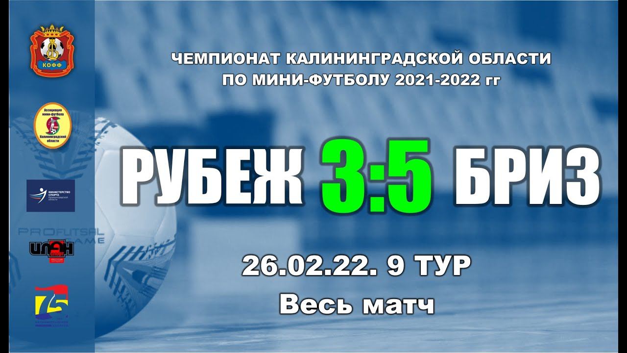 26.02.22. Чемпионат Калининградской области по мини-футболу. Суперлига. 9-й тур. «Рубеж» - «Бриз» 3:5 (2:5). Весь матч. Голы забили: Д.Чепкасов (5'), В.Ермаков (15'), А.Цыбульский (23') -- А.Крупин (7', 17'), А.Дулгарян (11'), Т.Тимофеев (19'), Д.Бирюков (20') Предупреждены: М.Полюга (Р), А.Ляпин (Р), А.Цыбульский (Р) -- А.Ишмаев (Б), В.Борисюк (Б), А.Крупин (Б) Удалены: нет