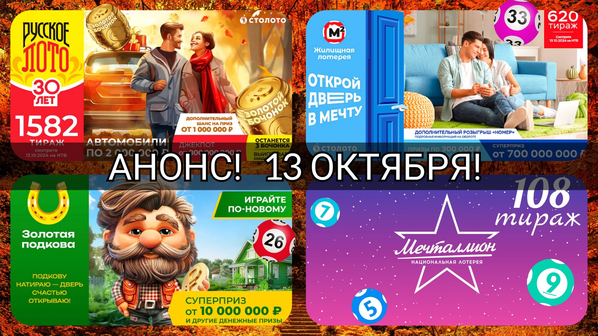АНОНС на 13 октября.РУССКОЕ ЛОТО 1582 тираж| ЖИЛИЩНАЯ лотерея 620 тираж| ЗОЛОТАЯ ПОДКОВА 476 тираж.
