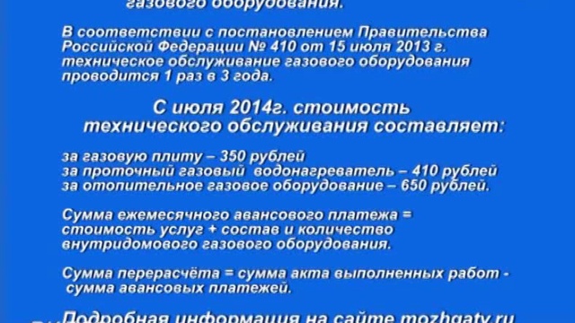 Филиал ОАО «Газпром газораспределение Ижевск» в г.Можге сообщает, что в июле 2014г. произведен перерасчет оплаты услуг по техническому обслуживанию внутридомового газового оборудования на основании актов выполненных работ, подписанных абонентом.