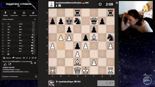 Друзья, всем привет. Партия со стрима, представляю вашему вниманию. Шахматы. Блиц 3+0 на chess.com. Если интересно, - подписывайтесь на канал, ставьте лайки, оставляйте комментарии. Поддержка через: DonationAlerts: https://www.donationalerts.com/r/onedebutplayer Бусти: https://boosty.to/onedebutplayer/donate Donatepay: https://new.donatepay.ru/@1272445 Или на карту в телеграм-канале: https://t.me/onedebutplayer/3