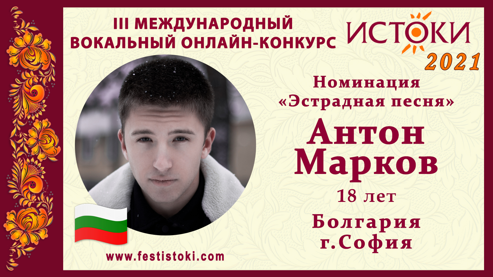 Лауреат II степени III Международного вокального онлайн-конкурса «Истоки». Номинация "Эстрадная песня". Песня "Too Close” Автор Алекс Клэр Сайт: www.festistoki.ru / www.festistoki.com E-mail: festistoki@mail.ru