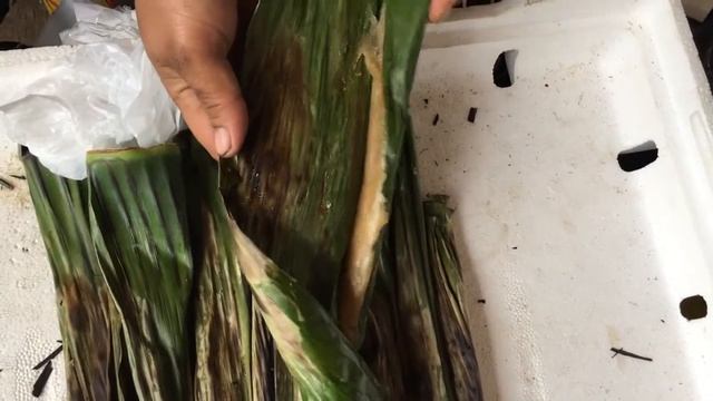 Такой интересный десерт готовят на филиппинских рынках. Не знаю, как звучит название этого десерта на русском языке, а по-филиппински это лакомство называется- Тупик. Как мне сказали изготовители этого блюда, оно готовится из риса. Ещё я почувствовал вкус кокоса.