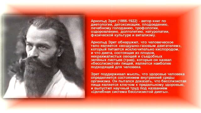 Фрагмент книги Арнольд Эрет "Целебная система бесслизистой диеты" Арнольд Эрет (Arnold Ehret) - профессор, почитаемый как истинный отец-основатель натуропатии, является самым важным исследователем и писателем о здоровье и сохранении человеческого тела. Ни один другой ученый, врач, диетолог или писатель не превзошел его работу касательно причин и лечения инфекционных и хронических заболеваний человека. Бесслизистая Диета Арнольда Эрета состоит из всех видов сырых и приготовленных некрахмалистых фруктов, овощей и трав. Целебная Система Бесслизистой Диеты - комбинация индивидуально определенных длительных или коротких голоданий с прогрессивно изменяющимися меню из продуктов, «не формирующих слизи». Одна только эта Диета может излечить практически любую болезнь без голодания, хотя такое лечение требует более длительного времени. Лишь сама Природа является единственным истинным целителем. Она избавляет через естественный сакральный процесс - через ГОЛОДАНИЕ - от любого недуга, от любой болезни. То, что не вылечит голодание, не вылечит уже ничто...