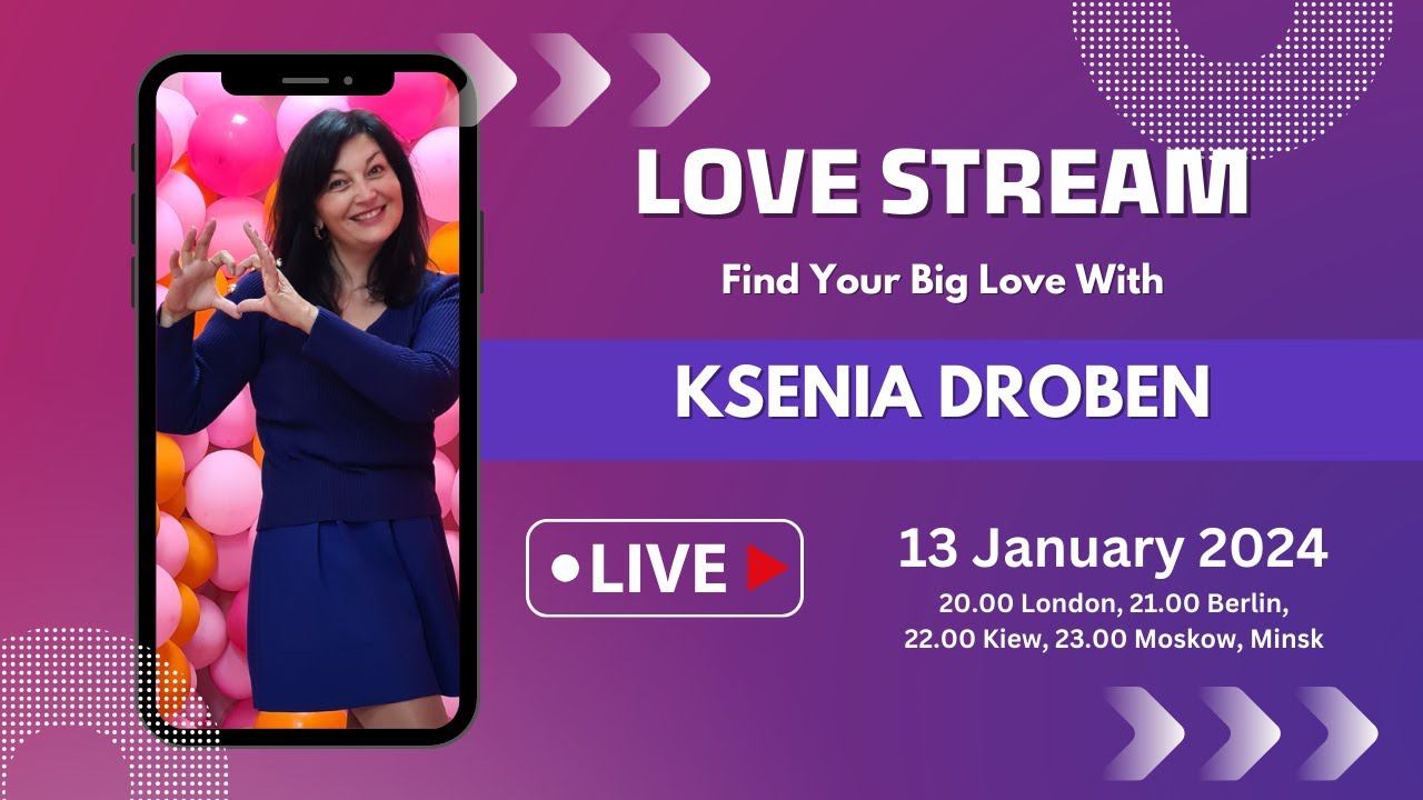 Love Stream (online live dating) When: Saturday 13 January Time: 8pm London, 9pm Berlin, 10pm Kiev, 11pm Moscow, Minsk Where: YouTube channel Ksenia Droben https://www.youtube.com/@KseniaDrobenPartnervermittlung Price: free Duration: 90 minutes What happens: Online games, video presentations, invited guests and dating experts, interesting facts, music breaks, communication with other viewers How does it work? You start with a chat in the comments and continue on Whatsapp. How do I exchange contacts? After the Love Stream, you will be invited to a Whatsapp group where you can exchange contacts. The recording of the Love Stream will remain on our YouTube channel https://www.youtube.com/@KseniaDrobenPartnervermittlung If you are unable to attend on the day, you will be able to watch the video later. Love Stream (live online) Wann: Samstag, 13. Januar Zeit: 20.00 London, 21.00 Berlin, 22.00 Kiew, 23.00 Moskau, Minsk Wo: YouTube-Kanal Ksenia Droben https://www.youtube.com/@KseniaDrobenPartnervermittlung Preis: kostenlos Dauer: 90 min Was passiert: Online-Spiele, Video-Vorstellungen, eingeladene Gäste und Experten, interessante Fakten, Musikpausen, Kommunikation mit anderen ZuschauerInnen Wie läuft das Kennenlernen ab? Sie beginnen mit einem Chat in den Kommentaren und setzen ihn mit Whatsapp fort. Wie kann ich Kontakte austauschen: Nach dem Love Stream werden Sie in eine Whatsapp-Gruppe eingeladen, in der Sie Ihre Kontakte austauschen können. Die Aufzeichnung des Love Streams bleibt auf unserem YouTube-Kanal https://www.youtube.com/@KseniaDrobenPartnervermittlung Wenn Sie an diesem Tag verhindert sind und nicht teilnehmen können, haben Sie die Möglichkeit, sich das Video später anzuschauen. Love Stream (в прямом эфире) Когда: суббота 13 января Время: 20.00 Лондону, 21.00 Берлину, 22.00 Киеву, 23.00 Москве и Минску. Где: YouTube канал Ksenia Droben https://www.youtube.com/@KseniaDrobenPartnervermittlung Стоимость: бесплатно Длительность: 90 минут Что ожидать: онлайн игры, представления участников, приглашенные гости, интересные факты, музыкальные вставки, общение с другими участниками в чате Как знакомиться: вы начинаете общение в комментариях к стриму и продолжаете в Whatsapp Как проходит обмен контактами: после стрима вы можете вступить в группу Whatsapp, где продолжите общение с кавалерами Запись стрима останется на нашем YouTube https://www.youtube.com/@KseniaDrobenPartnervermittlung Если вы не можете принять участие в прямом эфире, то сможете посмотреть запись в любое удобное для вас время