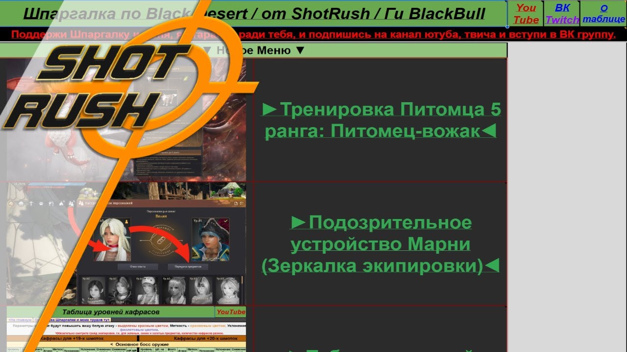 Полезное для всех и в основном новых игроков Black Desert. Подпишись на Твич - https://www.twitch.tv/shotrushsr Подпишись ВК группа - https://vk.com/shporashotrush Шпаргалка от меня - https://docs.google.com/spreadsheets/d/1bPTW-5cLh8rv-1FNwGNfuQZhG7k6PT0DynU1-le9fOc/edit#gid=2070533994 Мой Рутуб канал: https://rutube.ru/channel/16211294/ Мой Дзен: https://dzen.ru/id/65128972070ea622c4d1c7e1 --------------------------------------------------------------------------------------------------------------------------------------------------------------- ?Поддержать SHOT RUSH на — благотворительность, — поздравления, — развитие любимой группы или канал, — продвижение проектов, — поддержку творчества кумира, — и многое другое.?▼ https://www.donationalerts.com/r/shoterush На карту кому удобно тиньков - 5536 9139 4707 6440 --------------------------------------------------------------------------------------------------------------------------------------------------------------- ✅Играть через Офф. Сайт: https://www.ru.playblackdesert.com/ma... ✅Играть через Steam: https://store.steampowered.com/app/58... ?Играть через Фогейм: https://ru.4game.com/blackdesert/ --------------------------------------------------------------------------------------------------------------------------------------------------------------- Black Desert / BD: Новости Шпаргалки по Black Desert / от ShotRush то есть от меня (Версия 4.0.0) Тайм-коды: Нет смысла --------------------------------------------------------------------------------------------------------------------------------------------------------------- Кратко: Новости Шпаргалки (Версия 4.0.0) от 22.11.23: 1) Добавлена новая тема "Старые книги Кафраса, Ченга, Медали и другие (Откуда и Какие?)" 2) Обновлены показатели в Таблице Чистого заработка на спотах от 22.11.23 (Ждём Ребаланса Морфов). 3) Добавил в остальные темы (где это возможно было) и редактировал Кнопку "Поддержка Шпаргалки и моих трудов тут" - поймите меня тяжело очень работать над бесплатной Шпаргалкой. 4) Создал Категорию Нового Меню - и соответственно туда перемещены некоторые темы "Тренировка Питомца 5 ранга: Питомец-вожак, Подозрительное устройство Марни (Зеркалка экипировки), Таблица уровней кафрасов, Таблица порогов атаки и защиты, График появления мировых и полевых боссов Black Desert, Самое мощное снаряжение в игре (Легендарное), Гарантированное получение аксессуаров уровня V, Гарантированное получение снаряжения босса уровня V." 5) Исправлены ошибки, размеры текста, всякие правки и т.д. Ссылка на Шпаргалку: https://docs.google.com/spreadsheets/d/1bPTW-5cLh8rv-1FNwGNfuQZhG7k6PT0DynU1-le9fOc/edit#gid=2070533994 Поддержи меня что бы контент стал ещё лучше) https://www.donationalerts.com/r/shoterush На карту кому удобно тиньков - 5536 9139 4707 6440 --------------------------------------------------------------------------------------------------------------------------------------------------------------- Купоны: До 30 Ноября 23 года: UPCO-MING-5THA-NNIV BRID-GETO-OURH-EART До 28 ноября 23: WISH-EDHA-PPYB-DDAY До 31 декабря 2023г. RU5Y-EARS-TOGE-THER BDRU-5ANN-IVER-SARY RU5Y-EARS-WITH-LOVE ----------------------------------------------------------------------------------------------------------------------- -------------------------------------------------------------------------------------------------- #shotrush #обзор #bdo