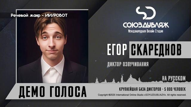 #СоюзДубляж #БазаДикторов #Озвучка ✔️Егор Скареднов, диктор озвучивания. Международная Онлайн-Студия "СОЮЗДУБЛЯЖ" - профессиональная озвучка и дубляж. ▪️Рабочая группа в Телеграм: https://t.me/soyuzdubliazh ▪️Контакт для связи: https://t.me/SoyuzAdmin ▪️Подпишись:https://www.youtube.com/c/SOYUZDUBLIAZH ▪️Сайт: https://www.soyuzdubliazh.com/ Лучшие голоса для вашей аудиорекламы и видеороликов. База дикторов - 5 000 человек, профессионального уровня на ENG| FR| TR| RU| ISR| AZ| UA| KZ| UZ| языках. Мужские и Женские топовые голоса для озвучки любых проектов, таких как: Рекламы, Презентации, Фильмы, Сериалы, Игры, Мультфильмы, ТВ Шоу, Аудио-видео визитки. ✔️Сотрудничая с нами вы получаете свой проект под ключ, не выходя из дома или офиса. Наша слаженная команда из лучших дикторов, актёров озвучивания, режиссёров и звукорежиссёров в кратчайшие сроки озвучат или отдублируют ваш заказ на профессиональном уровне. Образцы работ нашего портфолио вы сможете посмотреть на канале СОЮЗДУБЛЯЖ. ВНИМАНИЕ: ✔️Мы приглашаем специалистов озвучки к сотрудничеству в нашей команде. Вы можете пройти по ссылке в наш телеграм канал и связаться с Админом для обсуждения. ✔️Всем заказчикам подобных медиа проектов по озвучки и дубляжу фильмов, сериалов, документалок обращаться непосредственно к Админу Телеграм группы СОЮЗДУБЛЯЖ, пройдя по ссылке: Проходи по ссылке: https://t.me/soyuzdubliazh International Online-Studio SOYUZDUDLIAZH presents a highly professional approach in voice-over and dubbing. ▪️Our working group https://t.me/soyuzdubliazh ▪️Chief manager https://t.me/SoyuzAdmin ▪️Follow https://www.youtube.com/c/SOYUZDUDLIAZH ▪️Web: https://www.soyuzdubliazh.com/ We offer You the best Voices for your Audio commercials and Video`s. Our Database contains over 5 000 voices of native speakers and high-class foreign language specialists in ENG| FR| TR| RU| ISR| AZ| UA| KZ| UZ|. Male & Female top level voices for all the variety of dubbing projects such as commercials, presentations, movies, TV-series, video and computer games, cartoons, TV-shows, audio & video portfolio’s – all in one place. As your business partner we guarantee a turn-key project without you leaving your house or office. Our target is to make sure that the dubbing of your project is made as quick as possible by a well-coordinated and professional team of the best speakers, film and sound directors. To whom it may concern! We invite dubbing specialists to join our team. Please contact our manager on Telegram https://t.me/soyuzdubliazh