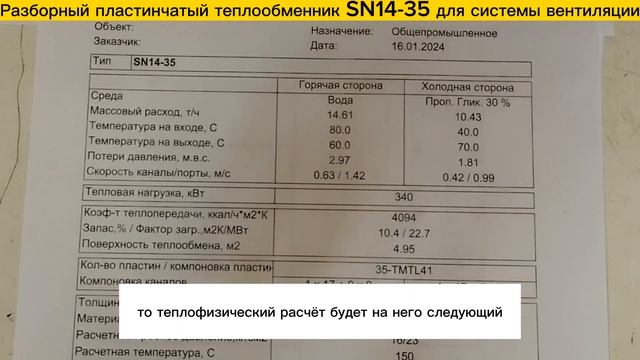 https://www.ozon.ru/product/plastinchatyy-razbornyy-teploobmennik-sn14-35-dlya-sistemy-ventilyatsii-moshchnost-340-kvt-1393195065/ Разборный теплообменник SN14-35 для систем вентиляции (отопление фанкойлами). Аппарат обладает следующими характеристиками: 1. Мощность - 340 кВт. 2. Греющий теплоноситель (вода). Вход:80С, Выход:60С 3. Нагреваемый теплоноситель проп. гликоль 30% (или вода). Его нагреваем с 40С до 70С. Теплоноситель 70С поступает в систему вентиляции на фанкойлы. 4. Фланцы: Ду50 ("2 дюйм"), 5. Поверхность теплообмена (4,95 м2) - 35 пластин ✅ Пластины теплообменника изготовлены из нерж. стали - AISI316 ✅ Высокие рабочие характеристики: макс. рабочее давление - 16 бар., макс. рабочая температура - 160С. ✅ Гарантия 3 Года ✅ Разборная конструкция позволяет легко промывать и обслуживать теплообменник. Мы производим пластинчатые теплообменники с 2009 года, поэтому можем предложить вам лучшие условия: ? - Предложим цену на 30% ниже рынка! ??️ - Изготовим ваш теплообменник за 1 день! ? - Надежно упакуем и доставим оборудование на ваш объект! ?? - Доставим теплообменник в любую точку России! ? - Расчет теплообменников ведется в сертифицированной программе расчета. Подберем на любую мощность и посчитаем за 15 минут! ? - Постоянная сервисная поддержка!