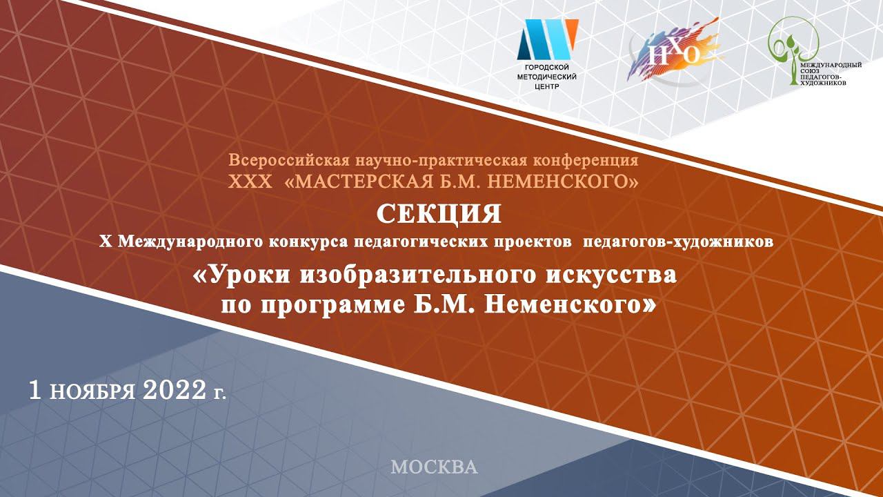 Научно-практическая конференция «Непрерывное художественное образование в системе управления процессами воспитания и социализации» XXХ Мастерская Б.М. Неменского 31 октября – 3 ноября 2022 года 11.00 – 14.00 Работа секции Уроки изобразительного искусства по программе Б.М. Неменского 0:10 - Дудкина Н.Г., учитель, педагог доп.образования ГБОУ Школа №1450 "Олимп" (Москва) 20:44 - Зозуля Ю.А., учитель ИЗО МБОУ Гимназия 1 (г. Краснознамёнск, Московская обл.) 37:08 - Логинова О.В., учитель ИЗО ГБОУ Лицей 533 Красногвардейского района (г. Санкт-Петербург) 55:06 - Лях Е. П., учитель ИЗО ГБОУ СОШ № 325 Фрунзенского района (г. Санкт-Петербург) 1:05:35 - Фомичева Ю.С., учитель ИЗО и черчения ГБОУ Школа №1564 (Москва) 1:22:20 - Ланкина О.В., учитель ИЗО ГБОУ Школа №1564 (Москва) 1:39:00 - Сазонова Н.А., учитель ИЗО ГБОУ Школа №1579 (Москва) 1:59:17 - Гражданинова Л. И., учитель ИЗО ЧУОО школа «Выбор» (Москва) 2:21:43 - Елисеева Е.В., учитель ГБОУ гимназия №446 Колпинского района (г. Санкт-Петербург) 2:35:33 - Абаплова Г.В., учитель ИЗО ГБОУ Школа № 1551 (Москва) 2:47:26 - Трохина Н.В., учитель ИЗО ГБОУ Школа № 1955 (Москва) 15.00 – 18.00 Работа секции «Результаты реализации оригинальных сценариев занятий по изобразительному искусству» 3:41:45 - Чистая О. И.,Панина Н.Н. и Ломиташвили В. Б., учителя ИЗО ГБОУ Школа №1798 «Феникс» (г. Москва) 3:57:28 - Хоменко М.В., учитель ИЗО ГБОУ СОШ №282 с углубленным изучением иностранных языков (г. Санкт-Петербург) 4:10:03 - Бережная Д.И., преподаватель МАОУ ДОД Троицкая детская школа искусств им. М.И. Глинки (г. Троицк, Москва) 4:20:26 - Шишкова В. В., учитель ГБОУ школа № 49 (г. Москва) 4:49:02 - Ковалёва Г.Н., преподаватель МАУ ДО ДХШ г. Калининграда 4:59:12 - Комцян Т.Б., преподаватель МАУ ДО ДХШ г. Калининграда 5:09:06 - Буланова С.Е., педагог доп. образования по ИЗО МБУ ДО ДШИ № 8 «Радуга» (г. Самара) 5:30:11 - Лукьянова Т.В., преподаватель МОУ ДО ДХШ г. Калининграда 5:46:37 - Кондратьева С.Б., учитель ИЗО МОУ Синьковская СОШ №1 (п. Новосиньково, Московская область) 6:06:19 - Холькина Елена Николаевна, учитель МОУ «СОШ №8» (г. Магнитогорск, Челябинская область) 6:17:04 - Шульц Инесса Робертовна, преподаватель МБУ ДО ДХШ №1 (г. Новосибирск) 6:35:02 - Сомов В.В., учитель ГБОУ гимназия № 73 «Ломоносовская гимназия» Выборгского района Санкт-Петербурга (г. Санкт-Петербург) 18.00 – 19.00 Работа секции «Педагогические публикации, сайты и работы со средствами массовой информации» 6:43:22 - Бакшинова Л.П., старший преподаватель ГБУ ДПО СПб АППО (г. Санкт-Петербург) 7:08:06 - Кудряшова А.Н., учитель ИЗО и технологии МОУ Гимназия №2 (г. Клин, Московская область)