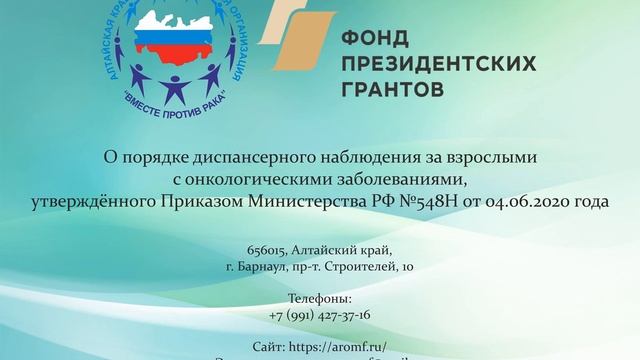 О порядке диспансерного наблюдения за взрослыми с онкологическими заболеваниями, утверждённого Приказом Министерства РФ №548Н от 04.06.2020 года Автор - Мац Ирина Владимировна Данный материал подготовлен и размещен на сайте АКОО «Вместе против рака» в рамках реализации проекта «Мое право на охрану здоровья» реализуется с использованием гранта Президента Российской Федерации на развитие гражданского общества, предоставленного Фондом президентских грантов.