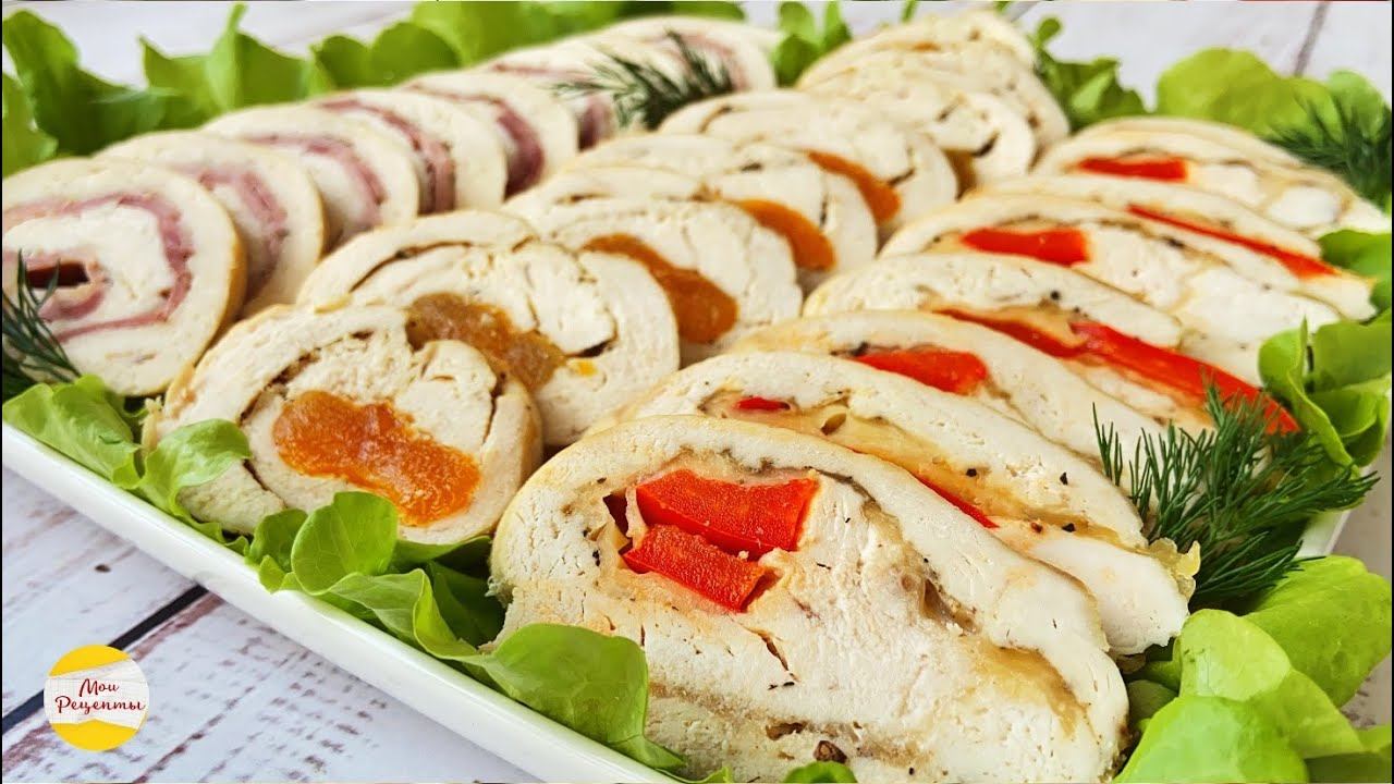 Яркая и аппетитная закуска на праздничный стол. Закуска готовится очень просто и быстро, а самое главное не затратно. Всем рекомендую приготовить рулетики с разными видами начинки на праздничный стол. Рулетики с ветчиной: Куриное филе 1шт Ветчина 100г Сыр твердый 50г Соль, перец по вкусу Сушеный чеснок Рулетики с курагой: Куриное филе 1шт Сок апельсина Курага 8шт Соль, перец по вкусу Рулетики со сладким перцем: Куриное филе 1шт Твердый сыр 30г Красный болгарский перец 0,5шт Соль, перец по вкусу Растительное масло для жарки Рулетики обжарить со всех сторон на растительном масле , затем отправить в духовку запекаться при 180 градусах 30 минут. Подавайте рулетики как праздничная закуска на салатных листьях. ************************************************* ✅Подписывайтесь на мой канал, у меня для вас много вкусных рецептов: https://is.gd/8v8u36