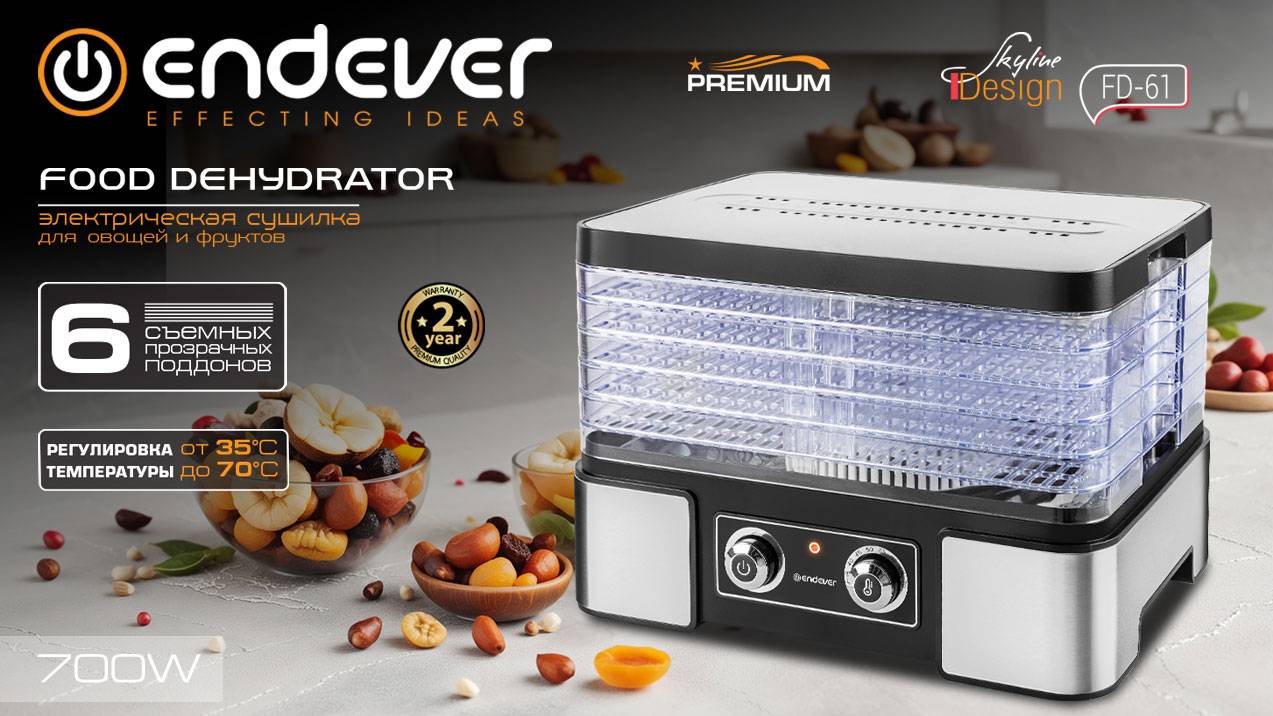 Представляем вам сушилку для овощей и фруктов Endever Skyline FD-61 с мощностью 700 Вт и регулировкой температуры от 35 до 70 градусов. В комплекте идет 6 съемных прозрачных поддонов, с помощью которых вы сможете контролировать процесс сушки. Также положение поддонов имеет 2 уровня: с маленьким зазором – для тонких овощей и фруктов и с большим зазором – для более толстых. Общий объем с большим расстоянием между поддонами составляет 12 л, а с маленьким – 7 л Прозрачные стенки позволяют следить за процессом без необходимости открывать устройство. Система сушки с циркуляцией горячего воздуха обеспечит быстрое и равномерное высушивание продуктов. Удобное механическое управление позволит легко настроить параметры сушки. Регулируйте высоту поддонов для оптимального распределения продуктов и получения наилучшего результата. По завершении работы сушилки вас оповестит звуковой сигнал. Автоматический вентилятор обеспечивает оптимальное воздушное циркулирование. Сушилка для овощей и фруктов Endever Skyline FD-61– идеальное решение для здорового и вкусного лакомства, которое вы сможете приготовить в удобное для вас время. Подробнее https://www.endever.su/catalog/drying_of_vegetables_and_fruits/endever_skyline_fd_61/