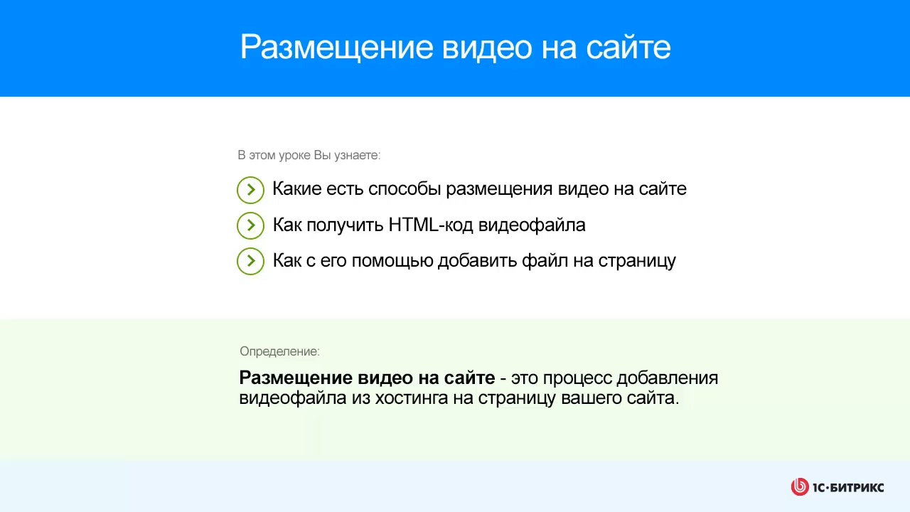 Размещение видео на сайте: - Какие есть способы размещения видео на сайте - Как получить HTML-код видеофайла - Как с его помощью добавить файл на страницу К уроку курса Контент-менеджер: https://dev.1c-bitrix.ru/learning/course/index.php?COURSE_ID=34&LESSON_ID=8623