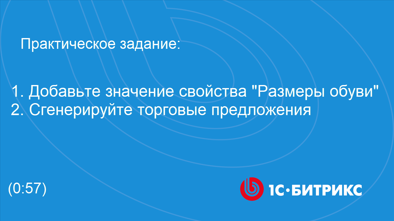 ** видео без голосового сопровождения Решение практического задания №1: "добавьте значение свойства и сгенерируйте торговые предложения" (курс "Администратор. Бизнес", глава "Торговый каталог") https://dev.1c-bitrix.ru/learning/course/index.php?COURSE_ID=42&CHAPTER_ID=04771