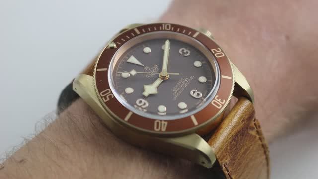 *перевести видео можно в Яндекс браузере Часы Tudor Black Bay Bronze (79250BM) с автоподзаводом, бронзовый корпус диаметром 43 мм, окруженный коричневым циферблатом, на коричневом кожаном ремешке с бронзовой пряжкой tang. Функции: часы, минуты и секунды.