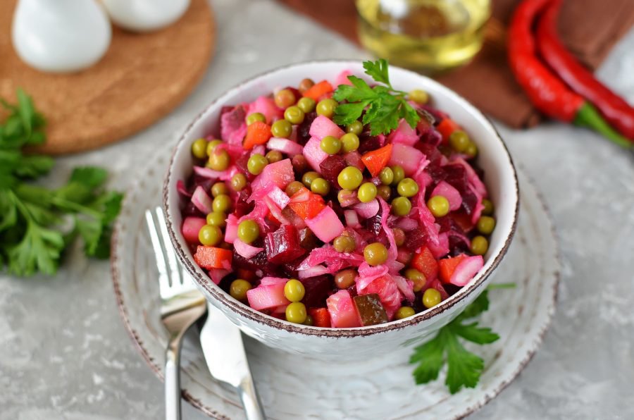 Винегрет — классический овощной салат, рецепт которого передается из поколения в поколение. Рецепт салата включает в себя свеклу, картофель, морковь, капусту, зеленый горошек и свежий репчатый лук.
