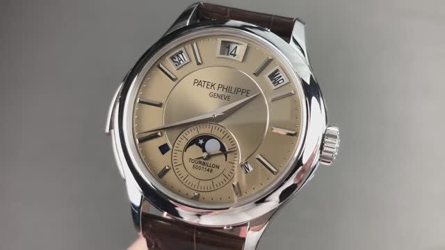 *перевести видео можно в Яндекс браузере Часы Patek Philippe Grand Complications с турбийоном и минутным репетиром Perpetual Calendar 5207P-001 выполнены из платины толщиной 41 мм и обрамлены бронзовым циферблатом на коричневом ремешке из кожи аллигатора. Вечный календарь Patek Philippe 5207P с турбийоном и минутным репетиром Grand Complications включает в себя часы, минуты, малую секундную стрелку, день недели, дату, месяц, индикатор високосного года, вечный календарь, турбийон, индикатор утра/вечера, фазу Луны и минутный репетир. Толщина этих часов Patek Philippe также составляет 14 мм, а расстояние от выступа до выступа составляет 51,4 мм. Для получения более подробной информации ознакомьтесь с полным обзором часов Patek Philippe Grand Complications с турбийоном, минутным репетиром и вечным календарем.
