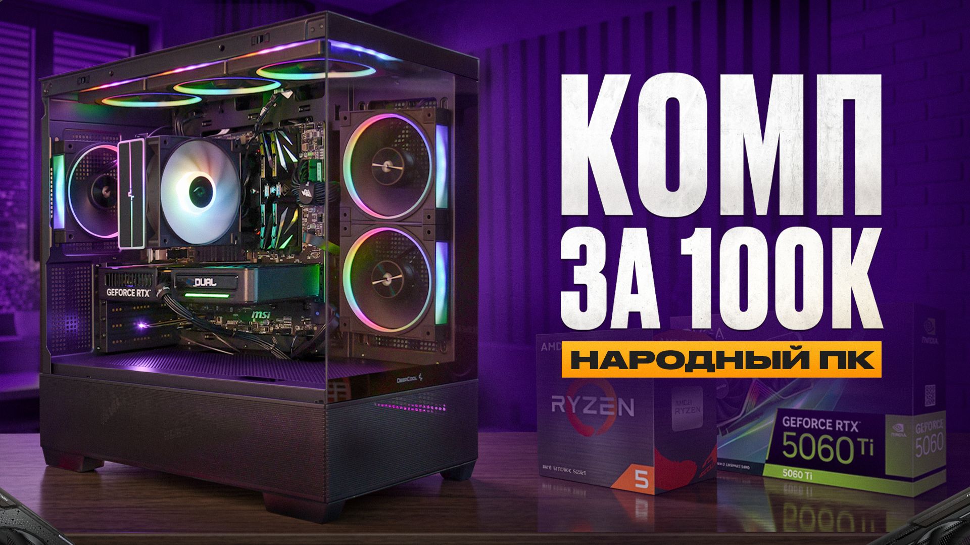 *Ссылки:* *Заказать ПК на Авито: https://www.avito.ru/brands/76ba8197ddab6af48bdb9129d047eab9* *Ламповый телеграмм канал: https://t.me/lampovolive* Привет, ламповые! 😎 Сегодня собрал для вас то, что вы чаще всего просите в комментариях — реальный народный игровой ПК за 100 тысяч рублей в 2026 году. Без воды, без понтов, из нового железа, которое тянет все свежие игры в Full HD на максималках и с небольшим апгрейдом комфортно заходит в 2K. Получился стильный аквариум с подсветкой, Ryzen 5 5600X + RTX 5060 (и вариант на 5060 Ti 16 ГБ), всё продумано, всё работает тихо и стабильно. Показал честные тесты, цены на сегодняшний день и как собрать самому или чуть доработать под себя. А ещё — розыгрыш! Обычная RTX 5060 8 ГБ от Palit (новая, с гарантией) достанется одному из вас. Просто лайк + подписка + любой комментарий под видео. Итоги 5 апреля в Телеге — подписывайтесь заранее, не пропустите. Спасибо, что вы здесь. Пишите, что думаете, какую сборку хотите дальше — всегда рад почитать и ответить. Кайфуйте от игр, друзья! 🚀 🔥 РОЗЫГРЫШИ 🔥 В этом видео мы разыграем - RTX 5060 8 ГБ от Palit + 3 рандомных комментатора получат по 1000 рублей! Условия: лайк + подписка + любой комментарий под видео. Итоги 5 апреля 2026 в моём Telegram-канале (ссылка в самом верху!) Правила - один аккаут, один комментарий, дубляж коментов не будет засчитан. Комплектующие: * Корпус - Deepcool CG380 3F Black - 4 700 рублей. * Процессор - AM4 AMD Ryzen 5 5600X 3.7GHz - 10 300 рублей. * Материнская плата - MSI B550M PRO-VDH WIFI - 9 500 рублей. * Оперативная память - DDR4 32Gb (16GB x 2) 3200Mhz Netac Shadow II - 22 000 рублей. * SSD - M.2 Kingston NV3 1TB - 12 299 рублей. * Кулер - DEEPCOOL AG400 BK ARGB V2 - 1 800 рублей. * Блок питания - 750W 1STPLAYER ACK GOLD - 6 200 рублей. * Видеокарта - Видеокарта RTX 5060 8Gb Palit DUAL - 31 000 рублей. * Вертушки - Deepcool FL12 SE ARGB - 2 100 рублей. Общий бюджет сборки - 99 900 рублей. --------------------------------------------------------------------- Тайм-коды: 00:00 | Вступление 00:38 | Розыгрыш 00:50 | Заказать ПК на Avito 01:11 | Корпус 02:28 | Процессор 03:31 | Материнка 04:25 | Оператива 05:25 | Накопитель 06:01 | Охлаждение 06:44 | Блок питания 07:26 | Видеокарты 09:15 | Розыгрыш 09:55 | Сборка 10:44 | Тесты RTX 5060 8GB 13:27 | RTX 5060 Ti 16GB 16:05 | Выводы и снова про розыгрыш ---------------------------------------------------------------------- Теги: #ПКЗА100К #КомпЗа100К #СборкаПК ПК за 100К Комп за 100К Игровой компьютер за 100 000 рублей ПК за 100К Комп за 100К Игровой компьютер за 100 000 рублей Сборка ПК за 100К Компьютер за 100 000 рублей ПК за 100 000 рублей Комп за 100 000 рублей Игровой ПК за 100К Сборка компьютера за 100К Бюджетный ПК за 100К Народный ПК за 100К Игровой комп за 100К ПК 100К 2025 ПК 100К 2026 Комп 100К 2025 Комп 100К 2026 Игровой компьютер 100К Сборка ПК за 100 000 рублей Компьютер для игр за 100К Как собрать ПК за 100К Игровой ПК за 100 000 рублей Бюджетный комп за 100К ПК за 100К для игр Комп за 100К для игр Сборка ПК 100К 2026 Игровой ПК 100 000 рублей Компьютер за 100К 2026 ПК за 100К 000 рублей 2026 Что можно собрать за 60К Народный ПК за 100К *По поводу сотрудничества:* *Почта - lampovo2020@gmail.com* *ВК - vk.com/medvedikkkk* *Телеграмм - @lampovo_privet*