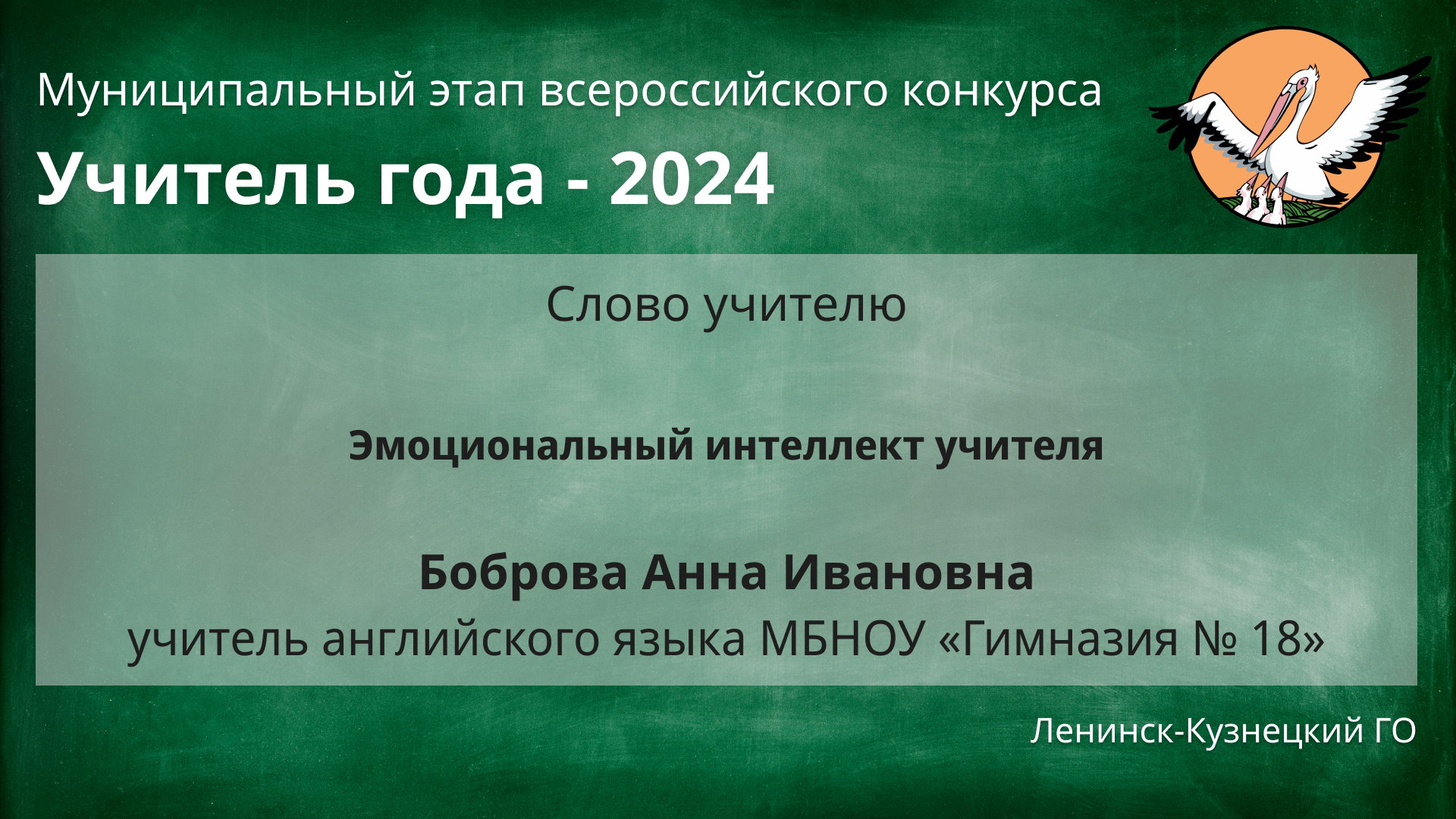 Слово учителю Боброва Анна Ивановна, учитель английского языка МБНОУ «Гимназия № 18» Тема выступления «Эмоциональный интеллект учителя» К материалу: https://nmclk.ru/16391/k-ug_2024