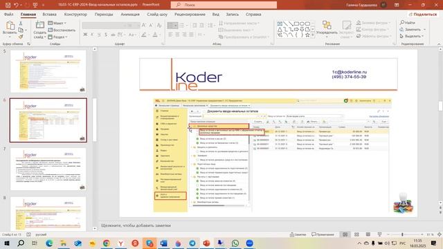 Компания «Кодерлайн» провела вебинар «1С:ERP. Ввод начальных остатков» Ведущая: Гардышева Галина - консультант-аналитик 1С:ЕRP Целевая аудитория для бухгалтеров, пользователей и специалистов ИТ-подразделений компаний различных отраслей. Описание При решении приобрести конфигурацию «1С:ERP» организация всегда встает перед выбором: с чего начать? Какие настройки можно рискнуть выполнить самостоятельно, а какие все-таки лучше доверить специалистам? Переносить данные на начало периода автоматическими средствами или быстрее и точнее с этим справиться с помощью ручного ввода? С этими вопросами мы сегодня будем разбираться на примере «1С:ERP». Программа 1. Особенности настройки ввода остатков; 2. Ввод взаиморасчетов; 3. Ввод баланса и счет 000; 4. Наиболее частые ошибки ввода; 5. Что нужно проверить; 6. Дополнительные сервисы, отчеты.