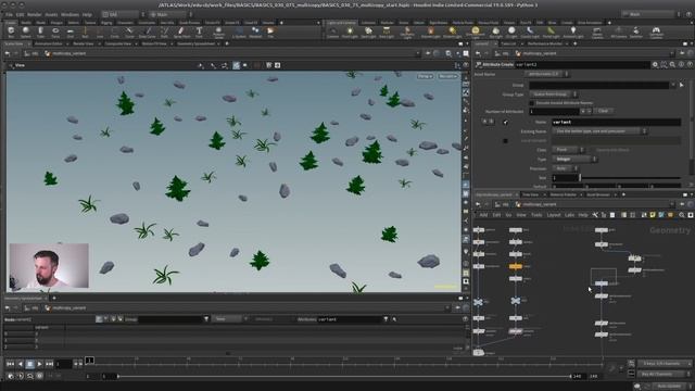 В этом видео показаны два основных метода рассеивания нескольких различных объектов. Первый метод — это новый подход в Houdini 18 с использованием атрибута «variant». Второй метод немного старше, но он более гибкий: использование цикла for. Идея заключается в том, что для каждой точки мы проходим по множеству точек и выбираем другой объект для копирования. Для этого мы используем выражение: point('../foreach_begin1', 0,'attrName',0)