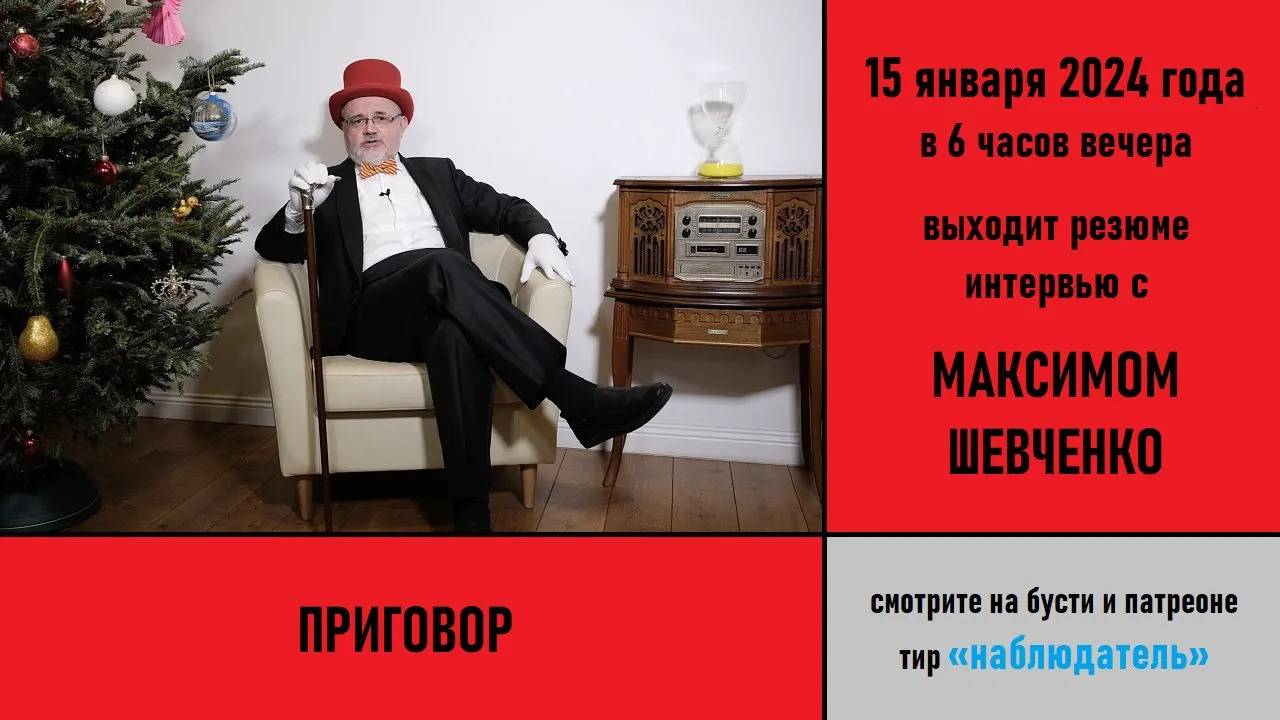 Видео с ютуба от 15 янв. 2024 г. 15 января 2024 года в 6 вечера выходит резюме интервью с Максимом Шевченко. Смотрите резюме на бусти и патреоне на тире «Наблюдатель»: https://boosty.to/galkovsky/posts/644c90b1-782f-4470-a3a5-76a70e2f7ac7 https://www.patreon.com/posts/96530191 Если вы пропустили само интервью: Первая часть интервью: https://rutube.ru/video/81cf4a906ac0e829618706374a399f67/ Вторая часть интервью: https://rutube.ru/video/a9ec3fd652621d410a8379ea451bdc43/ Третья часть интервью: https://rutube.ru/video/76015b0919c97abb5a462e7933f36837/ Ждём вас!