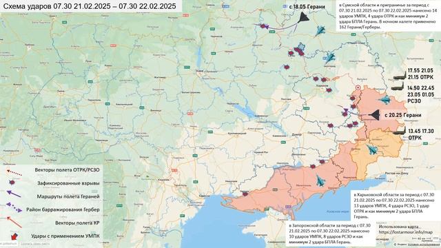 Анимированная схема ударов по территории Украины 21-22 февраля 2025 года