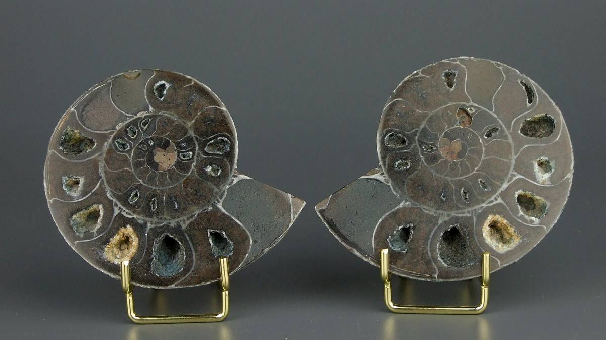 Черный аммонит Desmoceras из Мадагаскара, который разрезан пополам вдоль // 295nk