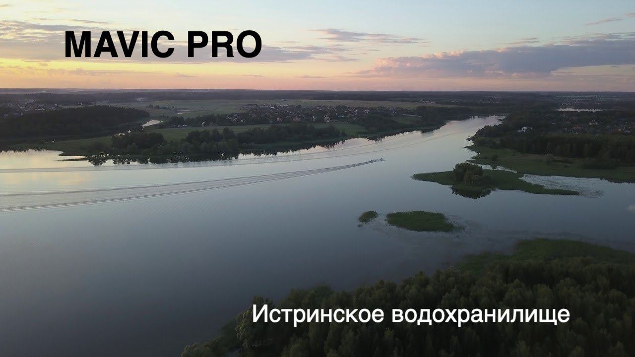 Истринское водохранилище. Запускал коптер Mavic Pro вечером, на закате. Погода была безветренная и безоблочная. Летал в районе деревень Шевлино, Бережки, Татищево. На воде полный штиль, что даже видны отражающиеся в ней облака. Лечу коптером в сторону дачи Пугачевой (с правой стороны, дом на берегу белого цвета). Слева остров и пролив "дарданеллы", за ним Татищево. Удивительно, что при такой погоде с аэродрома Шевлино не летали самолеты.