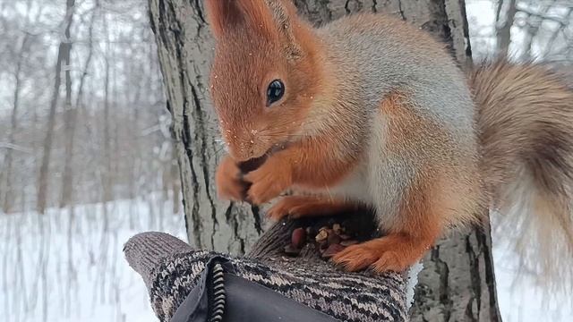 Белка сначала боялась потом освоилась.