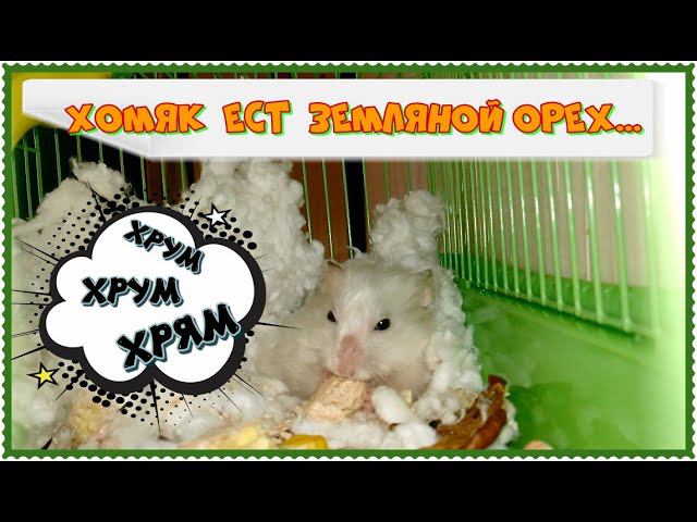 Хомяк сидит в клеточке и грызет орешки, разгрызая земляной орех и доставая арахис................................................