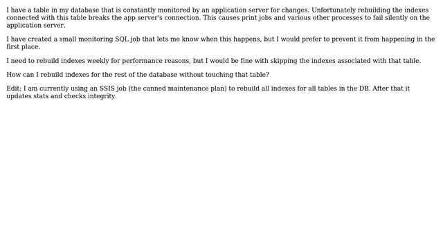 Databases: Can I Rebuild indexes in a DB except for one table? Helpful? Please support me on Patreon: https://www.patreon.com/roelvandepaar With thanks & praise to God, and with thanks to the many people who have made this project possible! | Content (except music & images) licensed under CC BY-SA https://meta.stackexchange.com/help/licensing | Music: https://www.bensound.com/licensing | Images: https://stocksnap.io/license & others | With thanks to user bluehiro (dba.stackexchange.com/users/7148), user Aaron Bertrand (dba.stackexchange.com/users/1186), and the Stack Exchange Network (dba.stackexchange.com/questions/20109). Trademarks are property of their respective owners. Disclaimer: All information is provided "AS IS" without warranty of any kind. You are responsible for your own actions. Please contact me if anything is amiss at Roel D.OT VandePaar A.T gmail.com