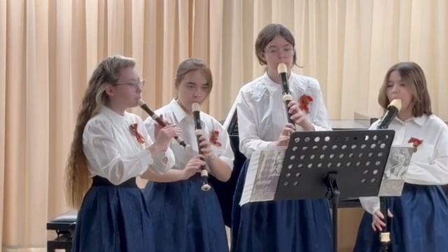 Проект «Музыка Победы» достиг своей кульминации! 19.04 юные музыканты нашей школы приняли участие в городском музыкально- историческом фестивале «Песни Победы в наших сердцах». Фестиваль был открыт музыкальным номером, приготовленным ансамблем «Дивертисмент»(преподаватель. Шукурова В.Г.). Девушки исполнили композицию из самых известных фронтовых песен: «Священная война», «Дороги» и «Катюша» (аранжировка С. Лошакова). Об истории создания этих песен вы уже знаете из предыдущих выпусков проекта. А завершён был фестиваль также учащимися нашей школы: группа третьеклассников (преподаватель Иванчикова Татьяна Александровна) представила песню «Четыре музыканта». Подробно о фестивале и прекрасном выступлении ребят читайте рассказ позже.