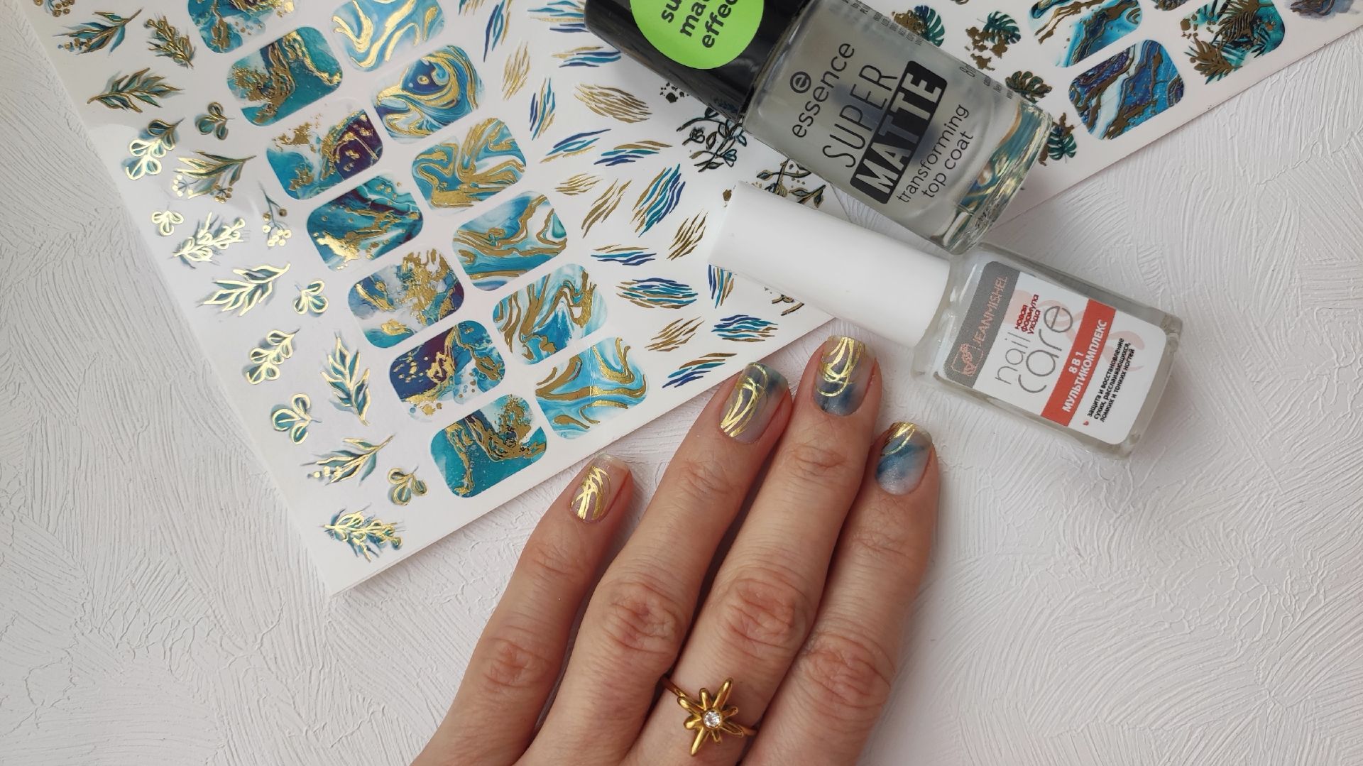 Делаю маникюр с помощью слайдер-дизайнов и обычных лаков, высыхающих на воздухе. Эффект акварели и золотистые элементы выглядя интересно и оригинально на ногтях.