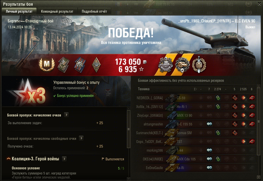 БЕРЛИН МАСТЕР на ELC EVEN 90 ОПЫТ: 1491 СУММАРНЫЙ УРОН: 4809 медаль ВОИН и ПАСКУЧЧИ