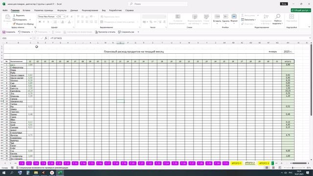 Меню - раскладка в программе Excel в детских садах , школа