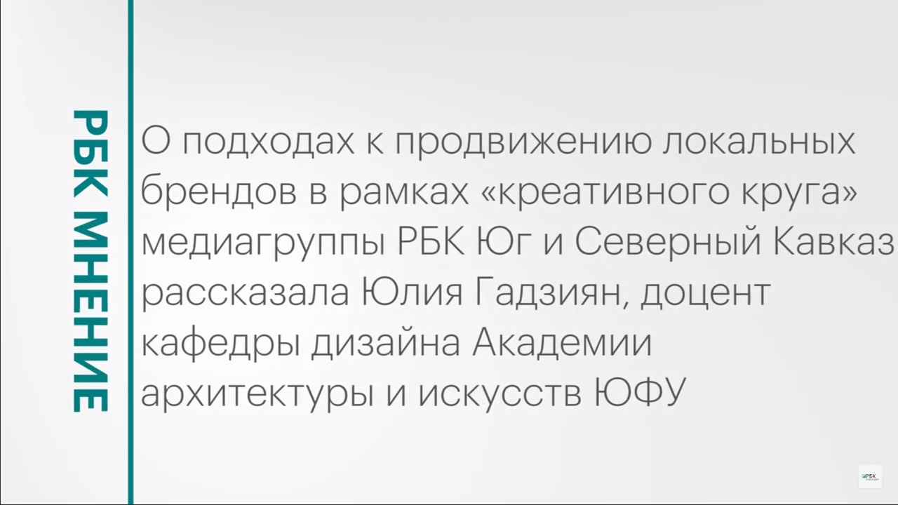 О подходах к продвижению локальных брендов в рамках «креативного круга» медиагруппы РБК Юг и Северный Кавказ рассказала Юлия Гадзиян, доцент кафедры дизайна Академии архитектуры и искусств ЮФУ. Подписывайтесь на нас в социальных сетях: ВКонтакте: https://vk.com/rbckuban Telegram: https://t.me/rbc_krasnodar Читайте новости, статьи и интервью на сайте РБК Кубань: https://kuban.rbc.ru/ Подпишитесь на канал, чтобы смотреть новые выпуски первыми!