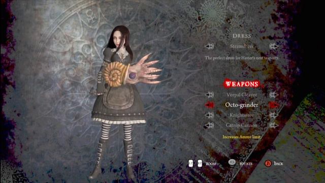 Alice DLC Weapons of Madness and two earned dresses - siren - and steamdress- DLC Weapons Pepper Grinder — Called the Octo-grinder, this weapon increases ammo limit and provides double the ammo. Hobby Horse — The Knightmare restores gamers' health with each hit. Teapot Cannon — This weapon increases damage to enemies by 50 percent. Vorpal Blade — This infamous weapon reduces damage from enemies by 50 percent.