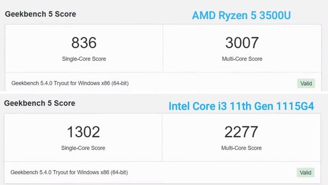 Intel Core i3 11th gen 1115G4 vs AMD Ryzen 5 3500U Geekbench Scores