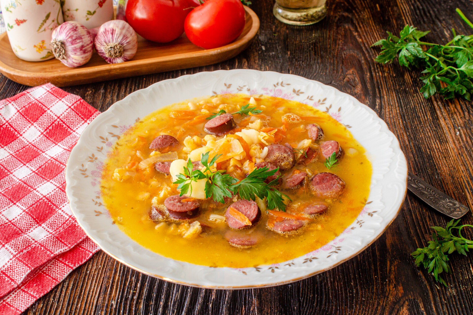 ГОРОХОВЫЙ СУП С КОПЧЕНОЙ КОЛБАСОЙ ИНГРЕДИЕНТЫ: Горох 400 гр. Вода 3 л. Варёно-копчёная колбаса 420 гр. Колбаса сырокопчёная 450 гр. Картофель 10-12 шт. Морковь 2 шт. Лук 2 шт. Оливковое масло Соль Можно добавить лавровый лист и перец чёрный молотый по вкусу (я не добавлял)