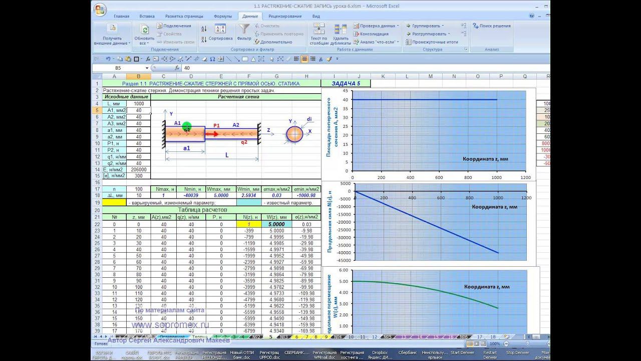 https://sopromex.ru/ - официальный сайт онлайн университета проф. Макеева С.А. Хотите избавиться от фобии сопромата? Хотите наконец-то уже разбираться в нем и быть как рыба в воде? Тогда подписывайтесь на мою авторскую рассылку бесплатных обучающих материалов: https://vk.com/app6379730_-62604840#l=2 Так понятно еще вам нигде не объясняли! Получить сам автоматизированный Excel-шаблон "Растяжение-сжатие стержней" со всеми 18 задачами (шаблонами) можно на сайте http://ps1besplatno.mcdir.ru/ В видео уроке 6 рассмотрены исследовательские задачи. В конце урока проведен мастер-класс по решению двух произвольных задач в реальном времени - показано, что любая задача на растяжение-сжатие с помощью нашего Excel-шаблона решается за 3-5 минут. http://www.youtube.com/watch?v=iQQJn-XB8Hg