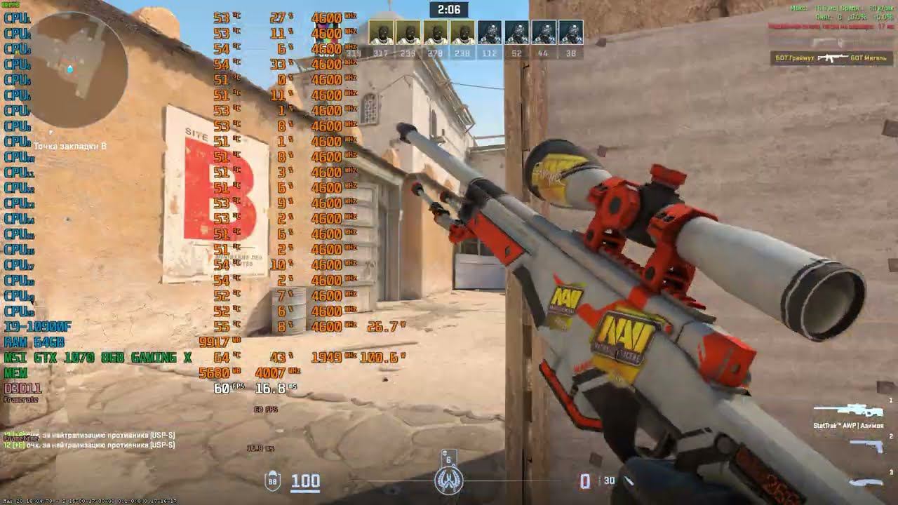 Game: Counter-Strike 2 Сomputer characteristics: Socket: LGA 1200 Motherboard: MSI MAG B560 MORTAR WIFI Processor: Intel core i9 10900F 2.8GHZ Liquid cooling systems: ID-Cooling FROSTFLOW X 360 RAM: 64GB DDR4-DIMM 2933 GPU: MSI GTX 1070 8GB GAMING X ROM: M2 SSD 256 OS+M2 SSD GAME+HDD 500GB+HDD 2TB+HDD 1TB Video in FULL HD resolution. Operating system: Windows 10 Pro --- Timecodes - 0:00 - The beginning of the video