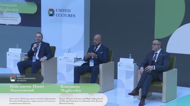 Сессия 3 Завершающим мероприятием в рамках блока «Познание истории через культуру» стала панельная дискуссия «Историческое наследие как формирующая среда», посвящённая сохранению культурного наследия и его социальному значению, связи исторического наследия и формирования духовно-нравственных ценностей, а также политике по сохранению историко-культурного наследия в новом многополярном мире. Модератором дискуссии выступил сопредседатель Российского исторического общества, заместитель Министра науки и высшего образования Российской Федерации Константин Могилевский. Участие в дискуссии приняли генеральный директор Музеев Московского Кремля Елена Гагарина, председатель Московской городской Думы Алексей Шапошников, член Совета директоров Международного института культурной дипломатии Аль Рахман Мохаммед Б. Абед и другие общественные и культурные деятели.