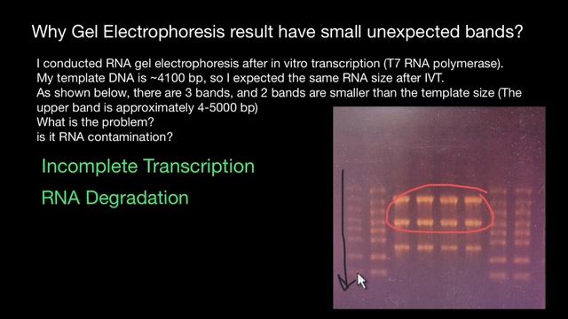 If you are observing unexpected smaller bands in your RNA gel electrophoresis, there are several potential reasons for this observation. Here are a few possibilities: Incomplete Transcription: The smaller bands could be the result of incomplete transcription, where the T7 RNA polymerase may terminate prematurely, resulting in shorter RNA fragments. This can happen due to various factors, such as template secondary structure, incomplete removal of inhibitors, or suboptimal reaction conditions. You can try optimizing the reaction conditions, including adjusting the concentrations of nucleotides, enzyme, template DNA, and incubation time. RNA Degradation: RNA is susceptible to degradation by RNases, which can be present in the environment or introduced during sample handling. It is essential to use RNase-free techniques, equipment, and reagents throughout the experiment. Ensure that all solutions and buffers are RNase-free, and handle the samples carefully to minimize the risk of RNA degradation. RNA Contamination: Contamination with smaller RNA molecules from external sources can also lead to the presence of smaller bands. This contamination can occur during sample handling, pipetting, or through airborne RNases. To minimize contamination, maintain strict aseptic techniques, use dedicated RNA workstations, and wear gloves while handling samples. Secondary RNA Structures: The formation of secondary structures within the RNA molecules can affect their migration pattern during gel electrophoresis. These structures can lead to anomalous migration and the appearance of smaller bands. Denaturing the RNA samples by heating them before loading onto the gel can help disrupt secondary structures and improve the resolution of the bands. Transcription Errors: Occasionally, T7 RNA polymerase can introduce errors during transcription, resulting in shorter RNA fragments. While this is less common, it can occur. Optimizing the transcription reaction conditions and using high-quality enzymes can help minimize the occurrence of transcription errors. To troubleshoot the issue, you can try the following: Verify the integrity of your template DNA by running it on an agarose gel to ensure it is intact and of the expected size. Repeat the in vitro transcription reaction, ensuring that all reagents are fresh and properly stored. Optimize the reaction conditions, such as adjusting the concentrations of nucleotides, enzyme, and incubation time. Take precautions to minimize RNA degradation and contamination by working in a clean, RNase-free environment, using dedicated equipment, and handling samples carefully. Denature the RNA samples by heating them at 65-70°C for 5 minutes and immediately placing them on ice before loading onto the gel. Consider verifying the size of the RNA fragments using alternative methods, such as qPCR or sequencing, to confirm the presence of smaller bands. By systematically addressing these factors, you should be able to identify and mitigate the cause of the unexpected smaller bands in your RNA gel electrophoresis. #dna #gelelectrophoresis #genetics #pcr #biology https://www.youtube.com/watch?v=tjhgvI0nJdw