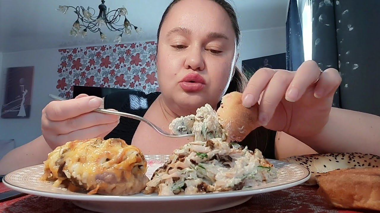 МУКБАНГСАЛАТИКИМЯСОс грибочкамиЧАЙс пирожнымПросто УЖИН