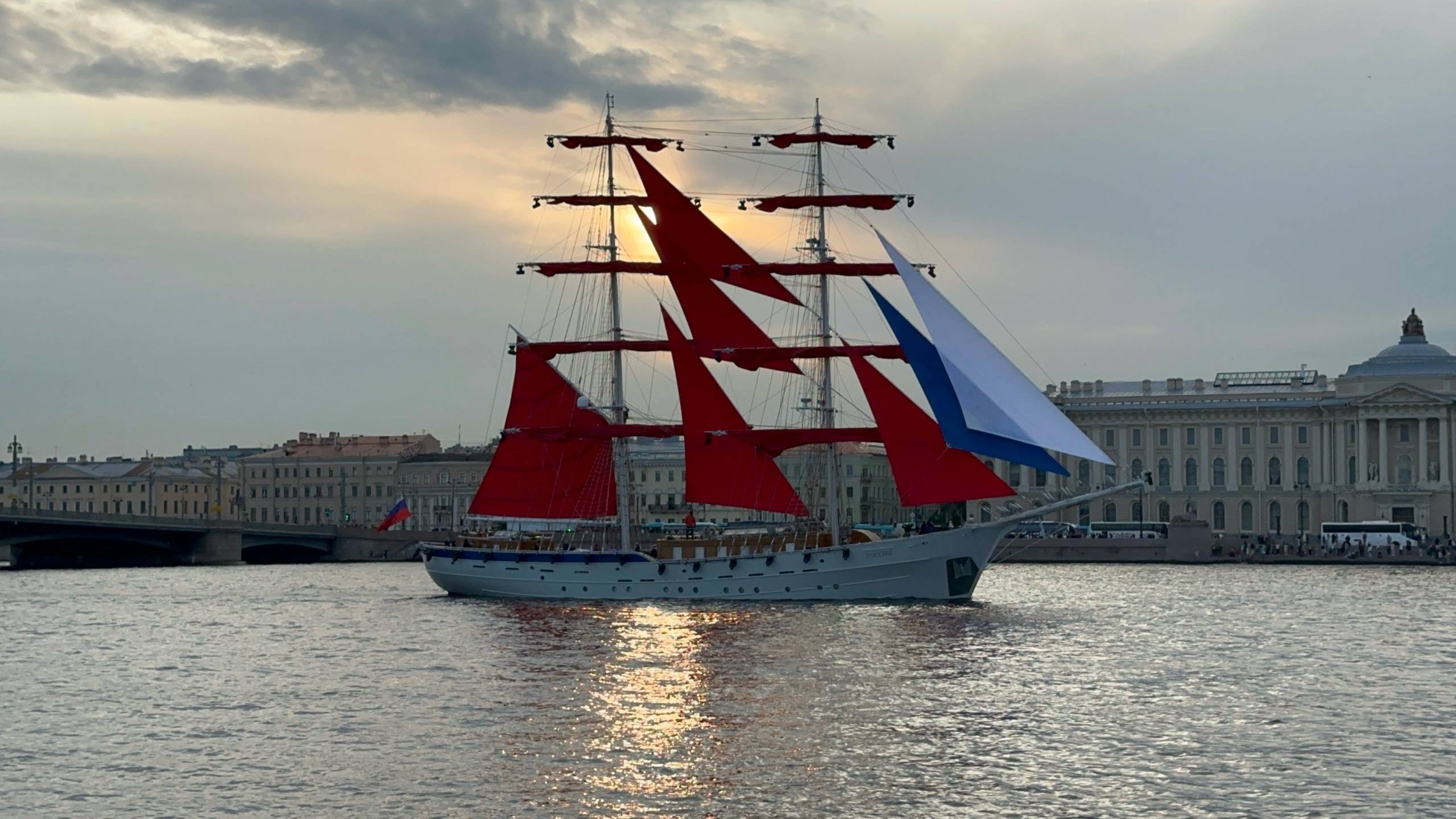 С Днём России! Репетиция Алых Парусов 2025. Бриг Россия на Неве проходит через разведённые мосты