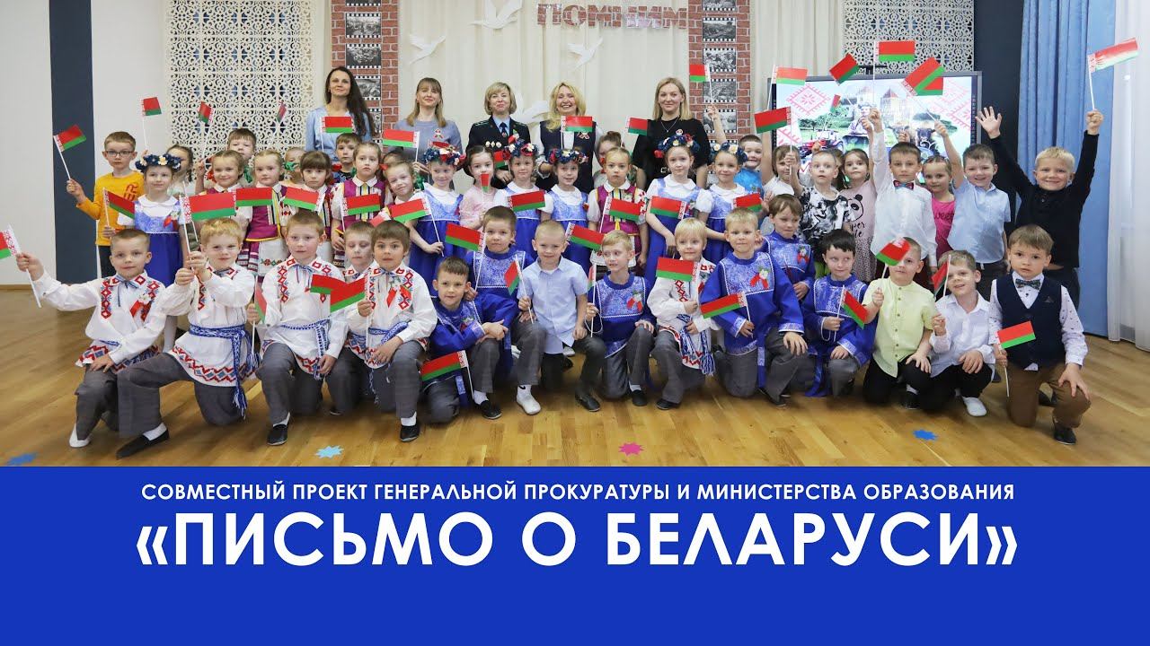 ПИСЬМО О БЕЛАРУСИ - совместный проект Генеральной прокуратуры и Министерства образования. Он знакомит детей с историческим прошлым нашей Родины, рассказывает о подвиге белорусского народа в годы Великой Отечественной войны, формирует представление о природных символах Беларуси, развивает интерес и уважение к государственным символам Республики Беларусь, воспитывает чувство гордости за свою страну, ее народ и культуру.