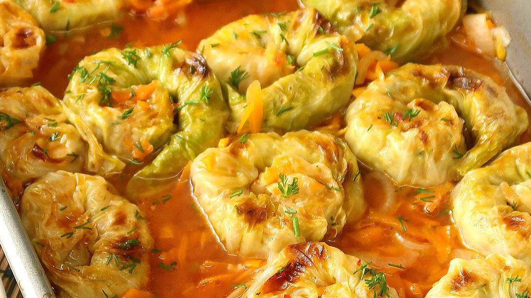 Голубцы улитки из молодой капусты с овощами в духовке.