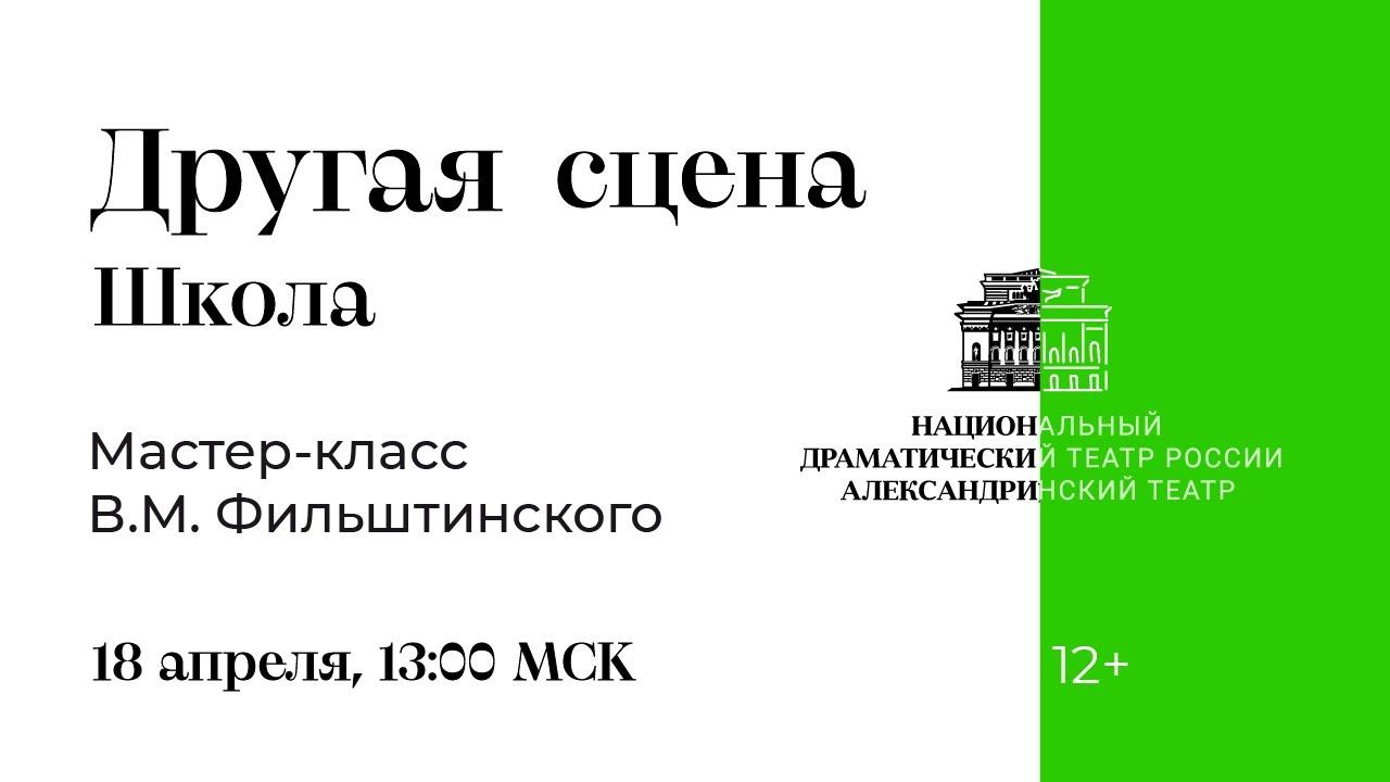 В проекте «Другая сцена. Школа» - мастер-класс Вениамина Михайловича Фильштинского - театрального режиссёра и педагога, профессора, заведующего кафедрой актёрского мастерства и режиссуры РГИСИ, заслуженного деятеля искусств Российской Федерации. В апреле 2023 года стартует четвёртый сезон проекта Александринского театра «Другая сцена». В Медиацентре Новой сцены Александринского театра Лев Додин, Вениамин Фильштинский, Юрий Красовский, Иван Благодёр и Игорь Качаев в цикле мастер-классов «Другая сцена. Школа» расскажут о своём творческом пути, педагогическом опыте, о том, какими навыками по их мнению должен обладать профессиональный актёр. Проведут практические мастер-классы. Аудитория проекта — это и широкий круг заинтересованной петербургской публики, театралов, начинающих профессионалов сферы, вход для которых будет бесплатным, по регистрации, и представители национальных театров России, участников, созданной по инициативе Александринского театра Ассоциации Национальных театров, которые будут подключаться и присоединяться к прямым трансляциям мастер-классов в режиме онлайн. МЕДИАЦЕНТР НОВОЙ СЦЕНЫ АЛЕКСАНДРИНСКОГО ТЕАТРА: Главный редактор - руководитель – Олеся Пушкина Режиссёр-постановщик – Кирилл Сбитнев Оператор-постановщик - Александра Спирина Линейный продюсер - Ольга Горячева Операторы - Александр Дегтярёв, Дмитрий Егошин, Павел Филиппов Видеоинженер - Николай Ермохин, Анатолий Зюков Грим - Дарья Соколова Звук – Андрей Мартынов Монтаж – Виктория Оцвера Генеральный продюсер Новой сцены Александринского театра - Александр Малич Официальный сайт: https://alexandrinsky.ru/ Вконтакте: https://vk.com/alexandrinskytheater Instagram: https://www.instagram.com/alexandrinsky/ Facebook: https://www.facebook.com/newstagealexandrinskytheater/