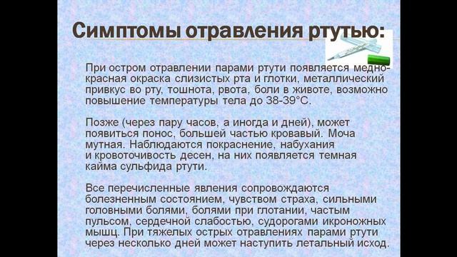 Ртуть используют при изготовлении медицинских градусников и энергосберегающих ламп. Опасен для здоровья даже в минимальных количествах. При попадании в организм человека через дыхательные пути, ЖКТ и даже неповрежденную кожу, ртуть почти всегда вызывает отравление. В зависимости от количества и длительности действия причинного фактора, ртутное отравление может быть острым или хроническим.