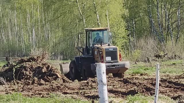 Архивное. Проект Булыгина. Тяжелый фронтальный погрузчик корчует березовые пни. 24042024.